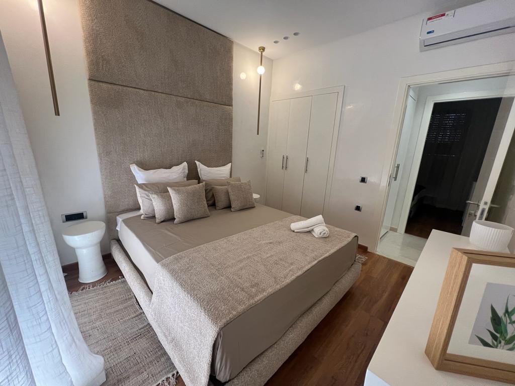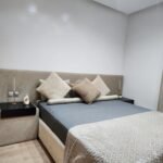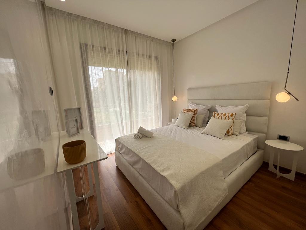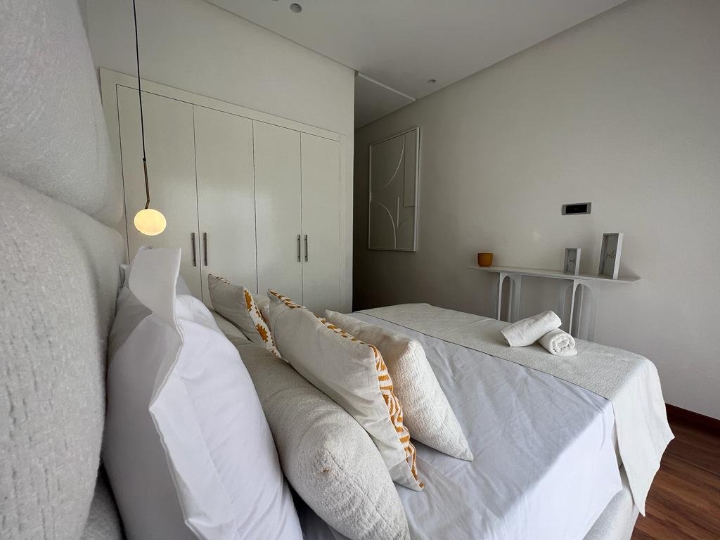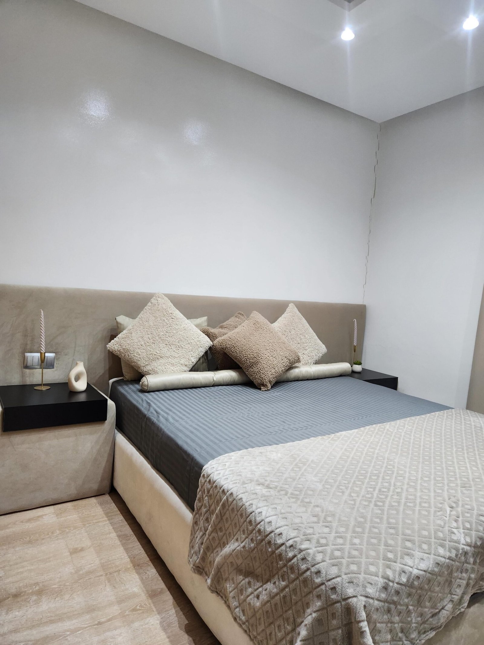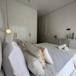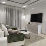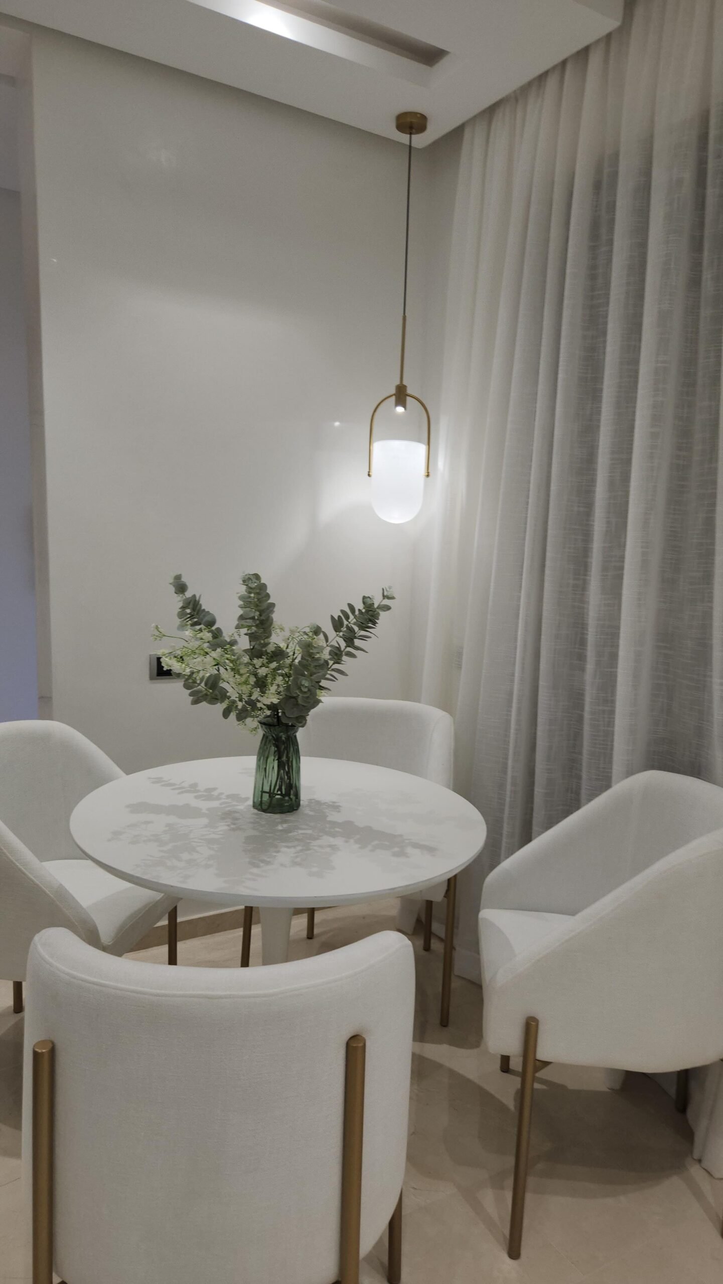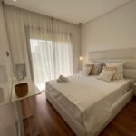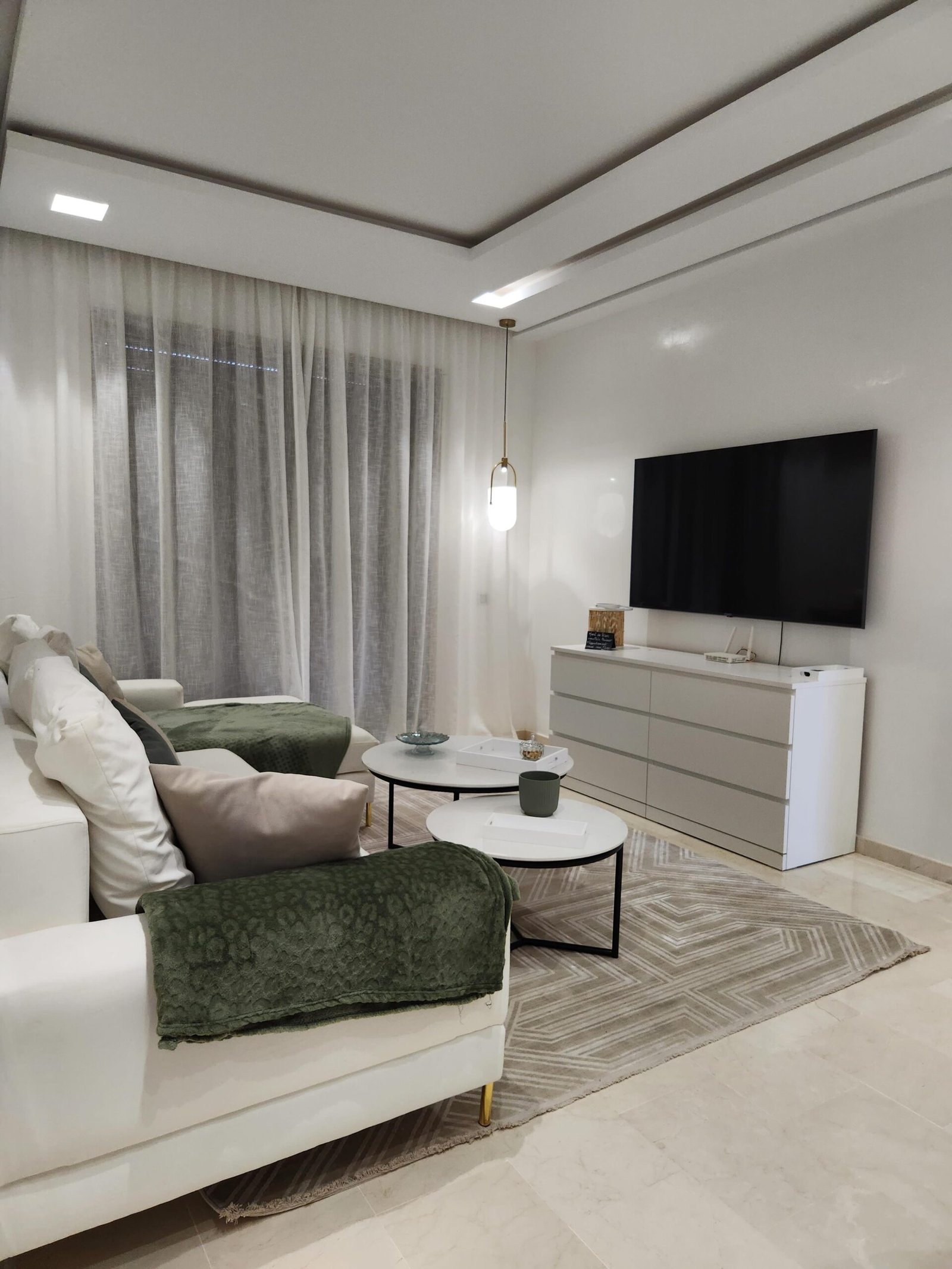 Le salon, cosy et lumineux, associe rideaux vaporeux, mobilier épuré et éclairage doux. Les chambres, conçues comme de véritables suites hôtelières, mêlent têtes de lit matelassées, suspensions design et literie haut de gamme.