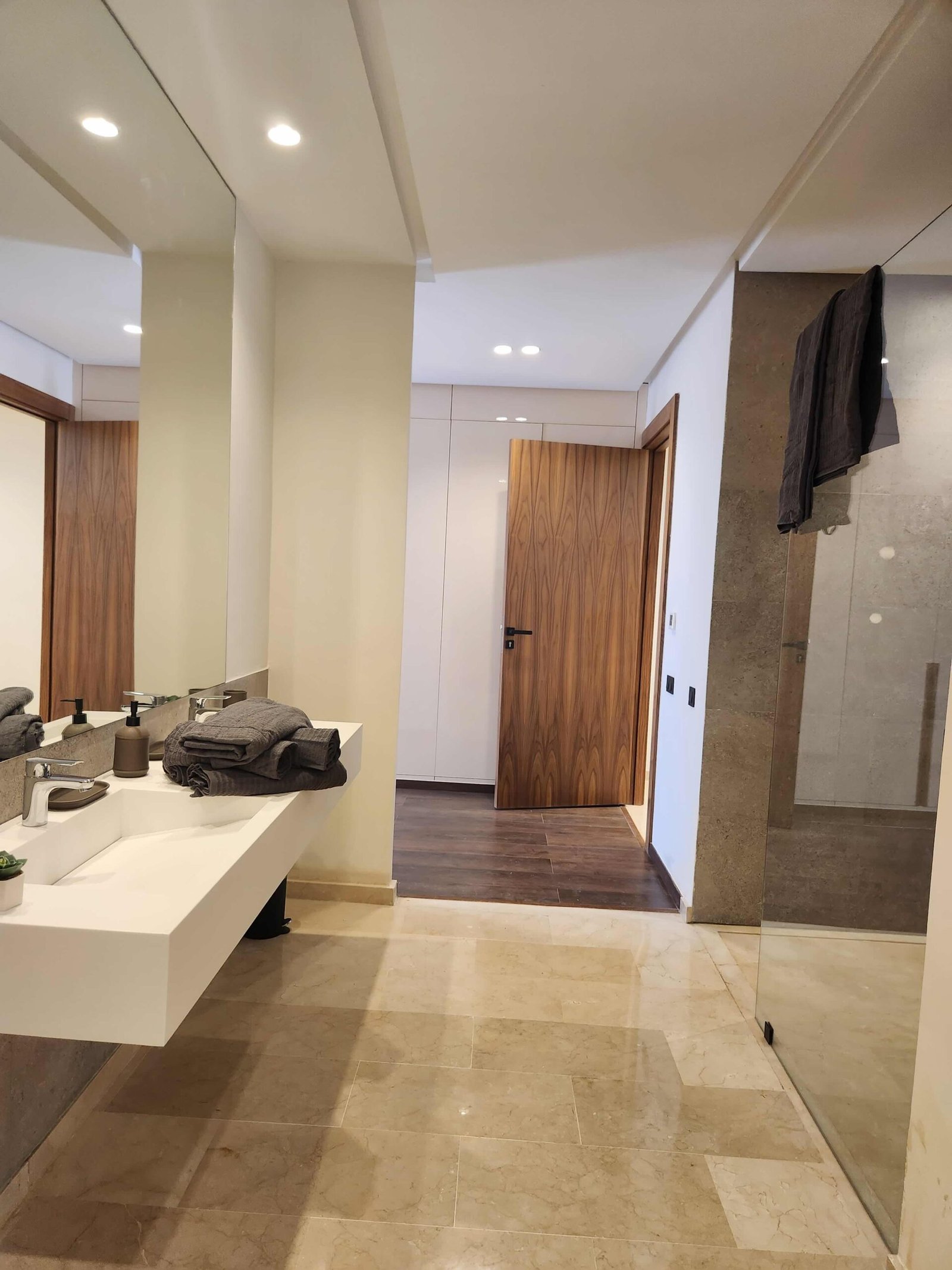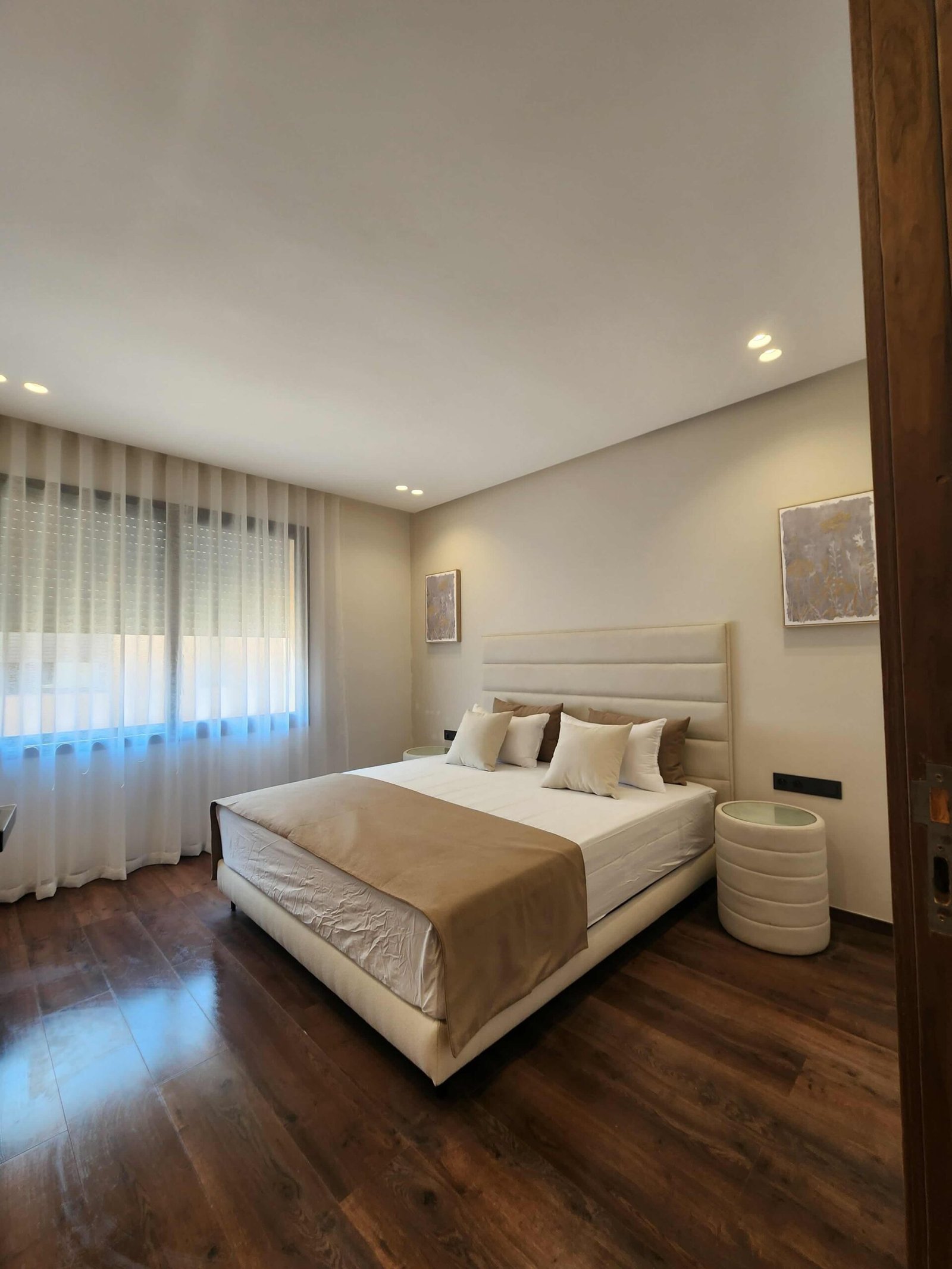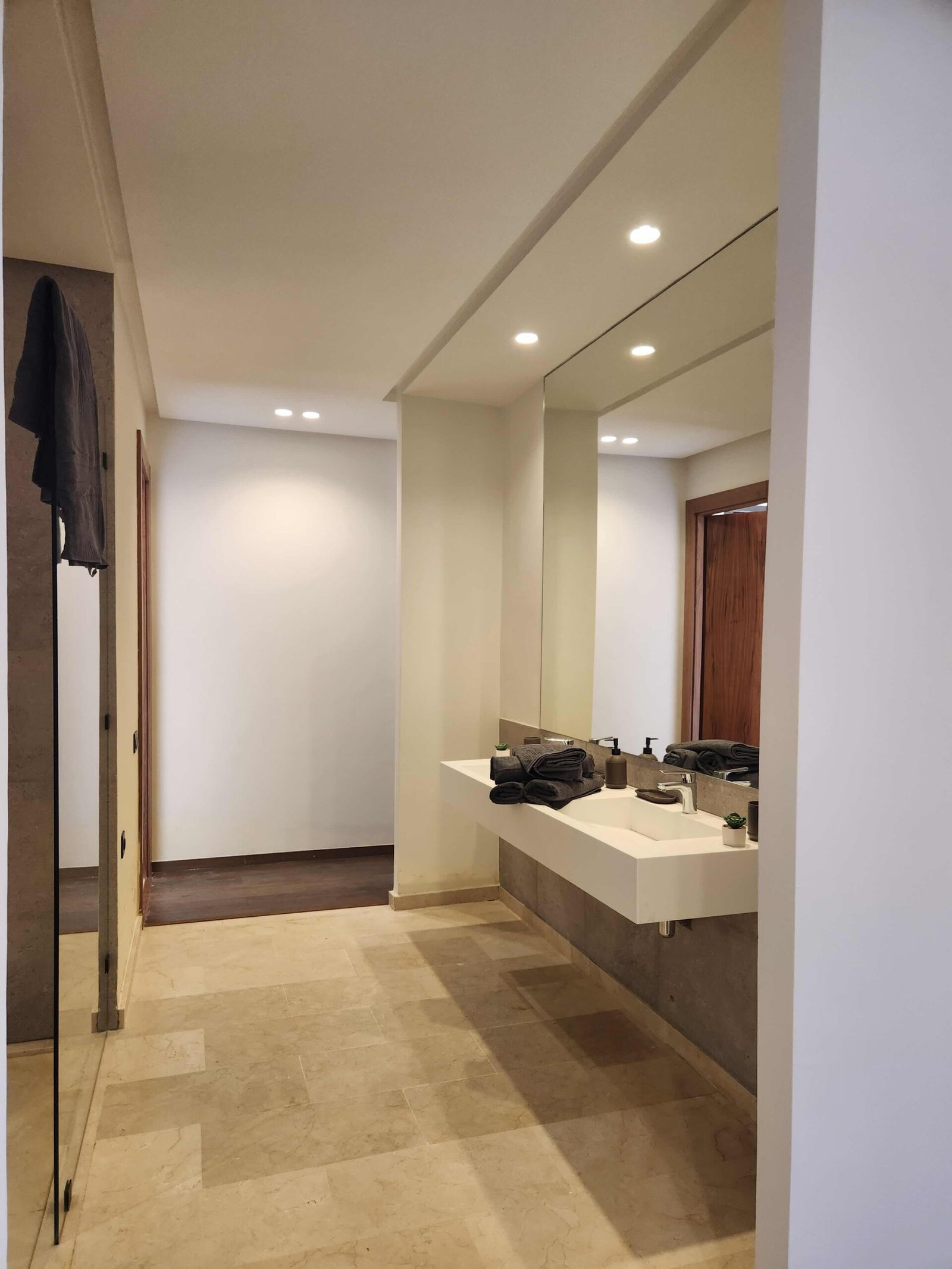 Ce projet repose sur l’art de suggérer sans imposer. Les teintes naturelles — beige, blanc cassé, lin — enveloppent les espaces dans une atmosphère feutrée. Le mobilier, minimaliste et intégré, accentue la lisibilité des volumes.