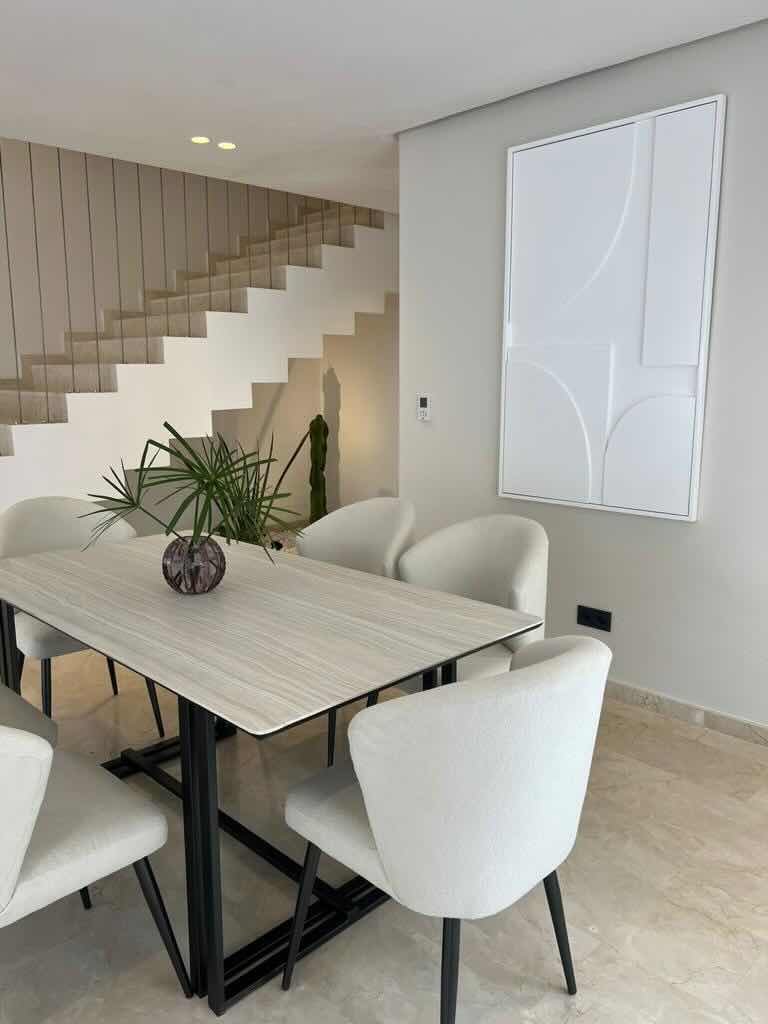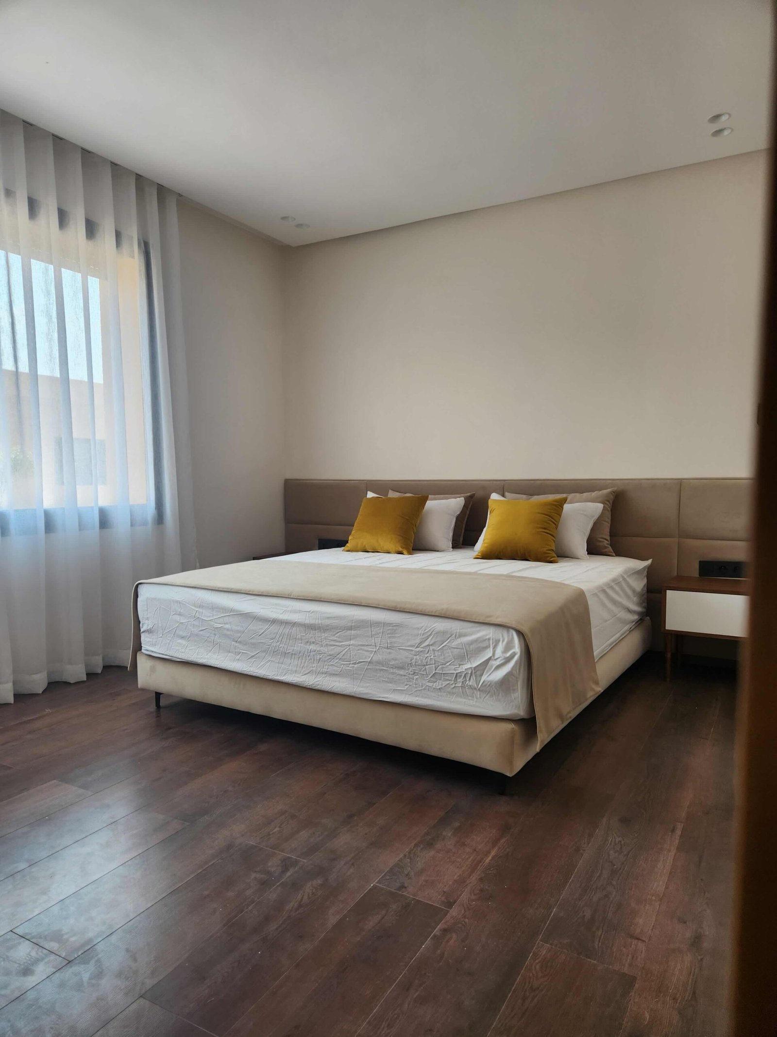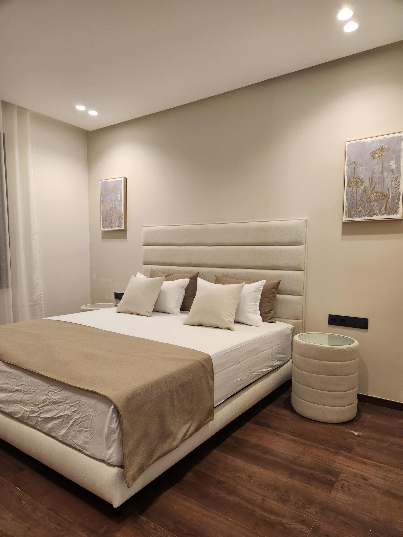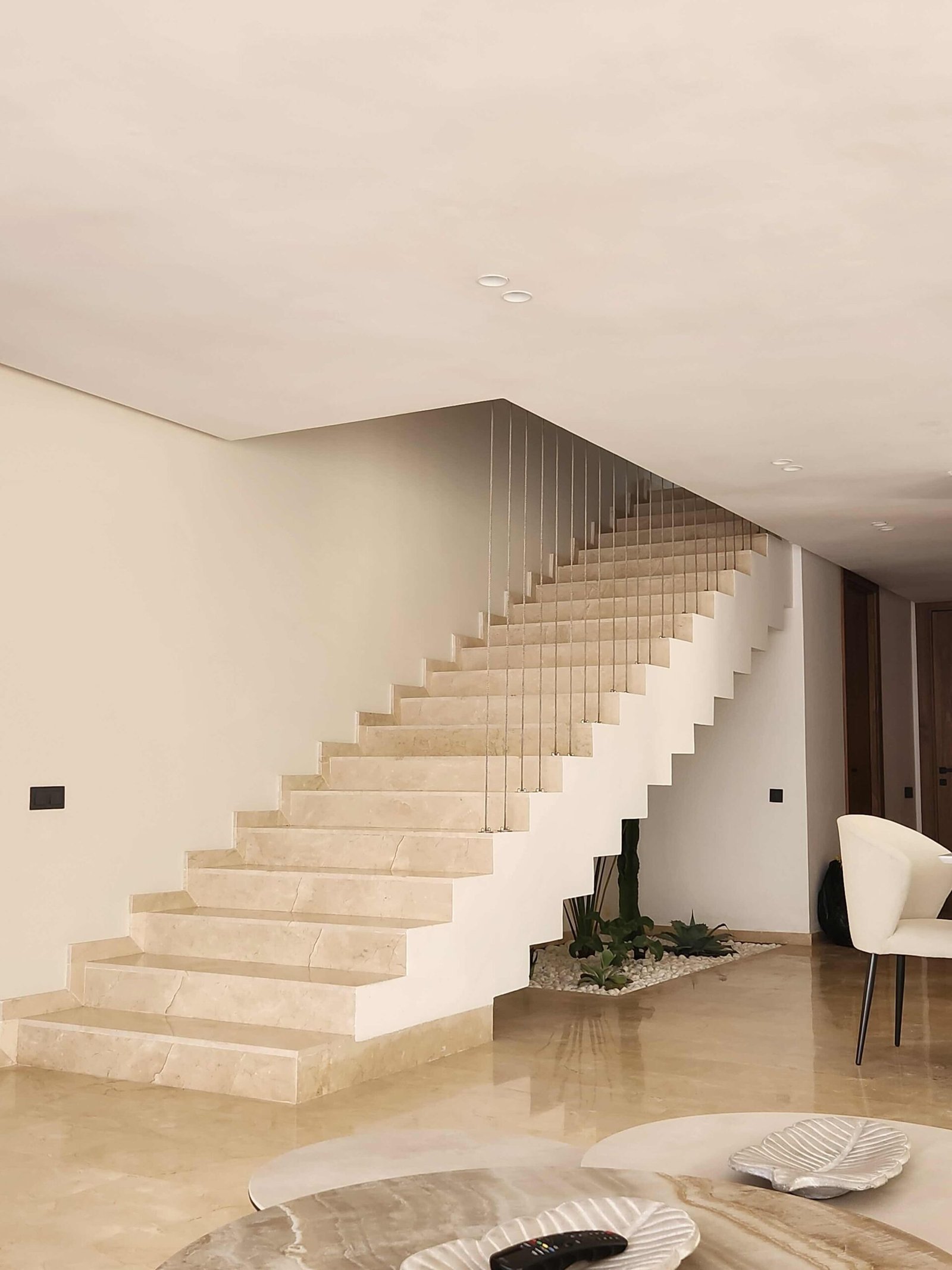 Ce projet repose sur l’art de suggérer sans imposer. Les teintes naturelles — beige, blanc cassé, lin — enveloppent les espaces dans une atmosphère feutrée. Le mobilier, minimaliste et intégré, accentue la lisibilité des volumes.