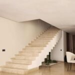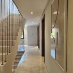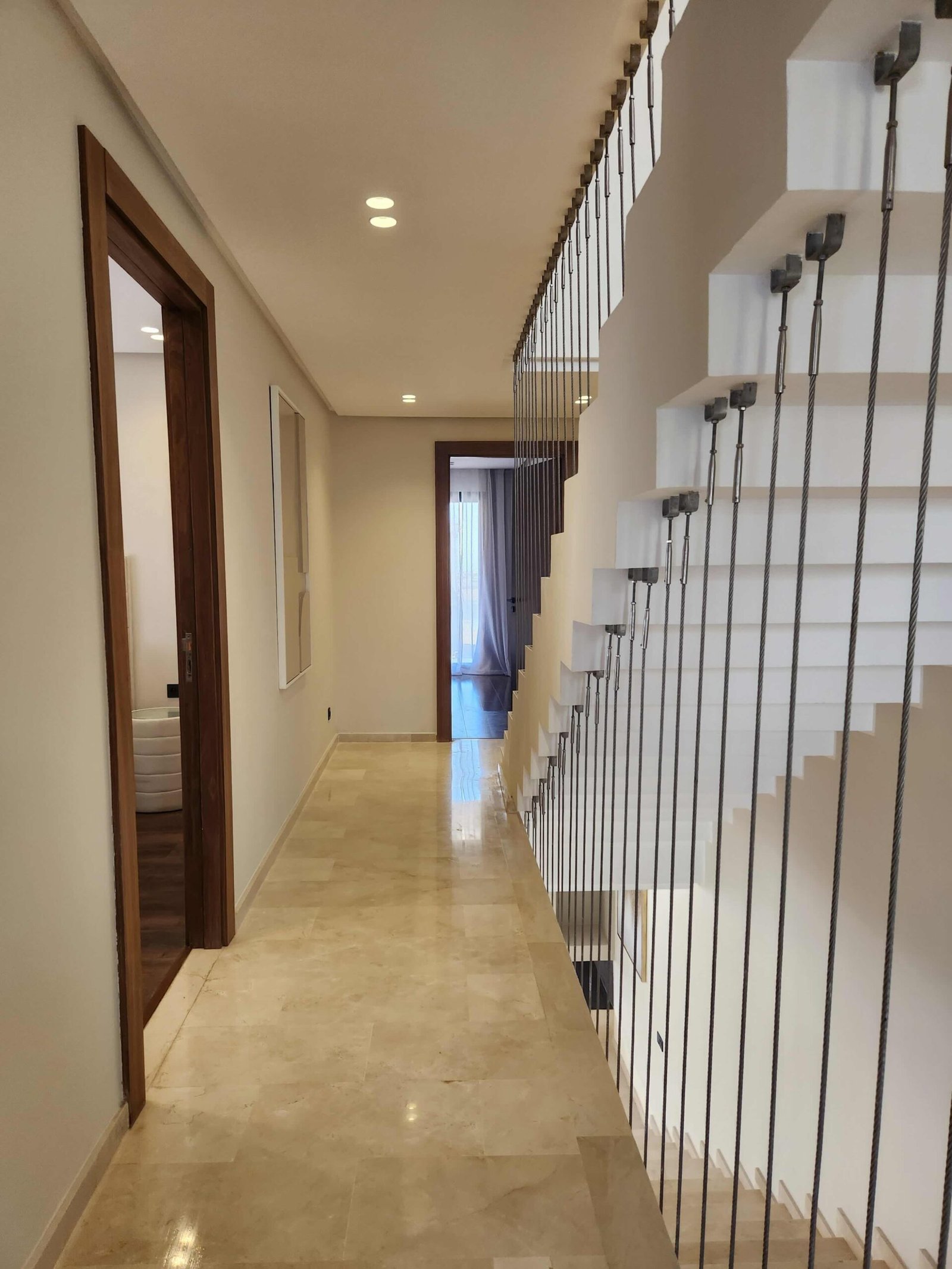 L’escalier, élément structurant, devient également signature architecturale, avec ses lignes droites, ses contremarches flottantes et ses éclairages indirects qui rythment la montée.