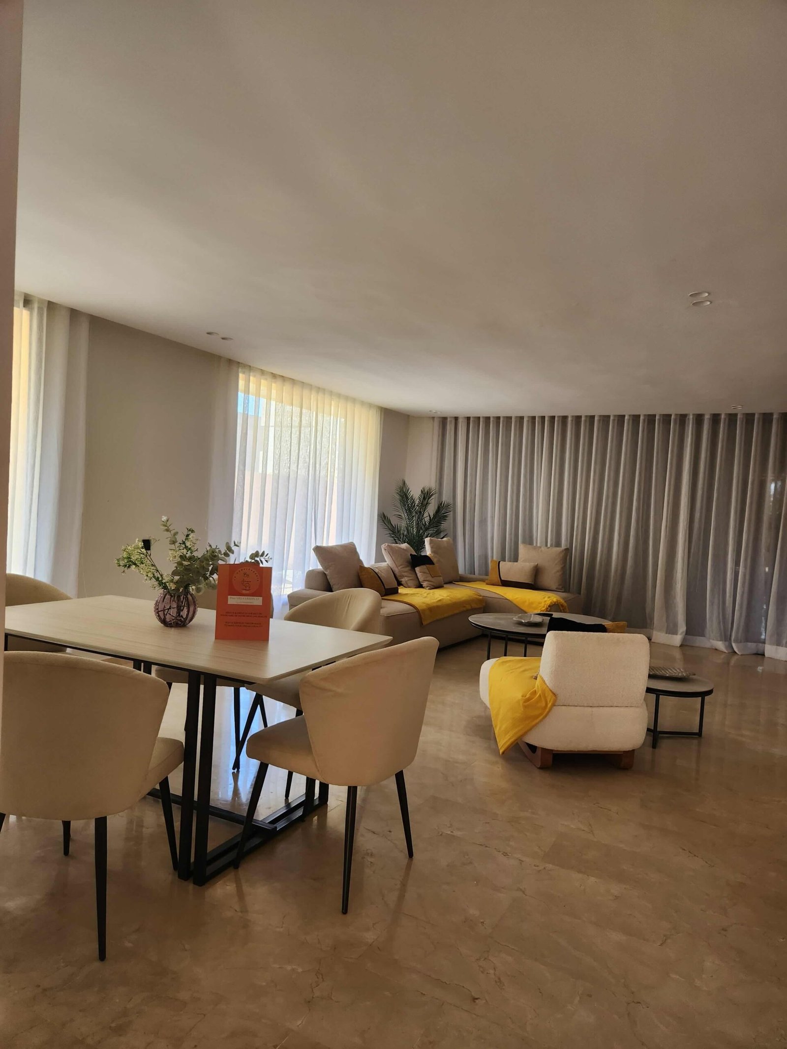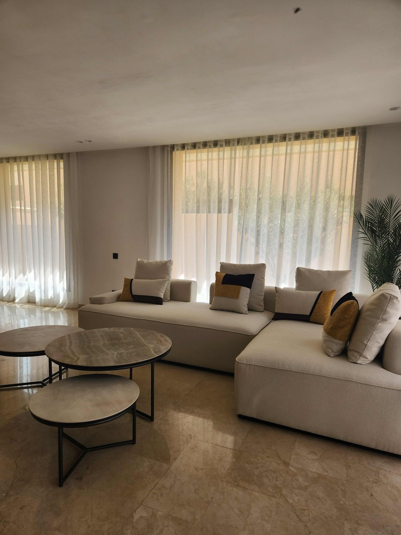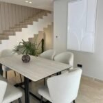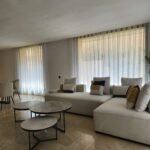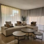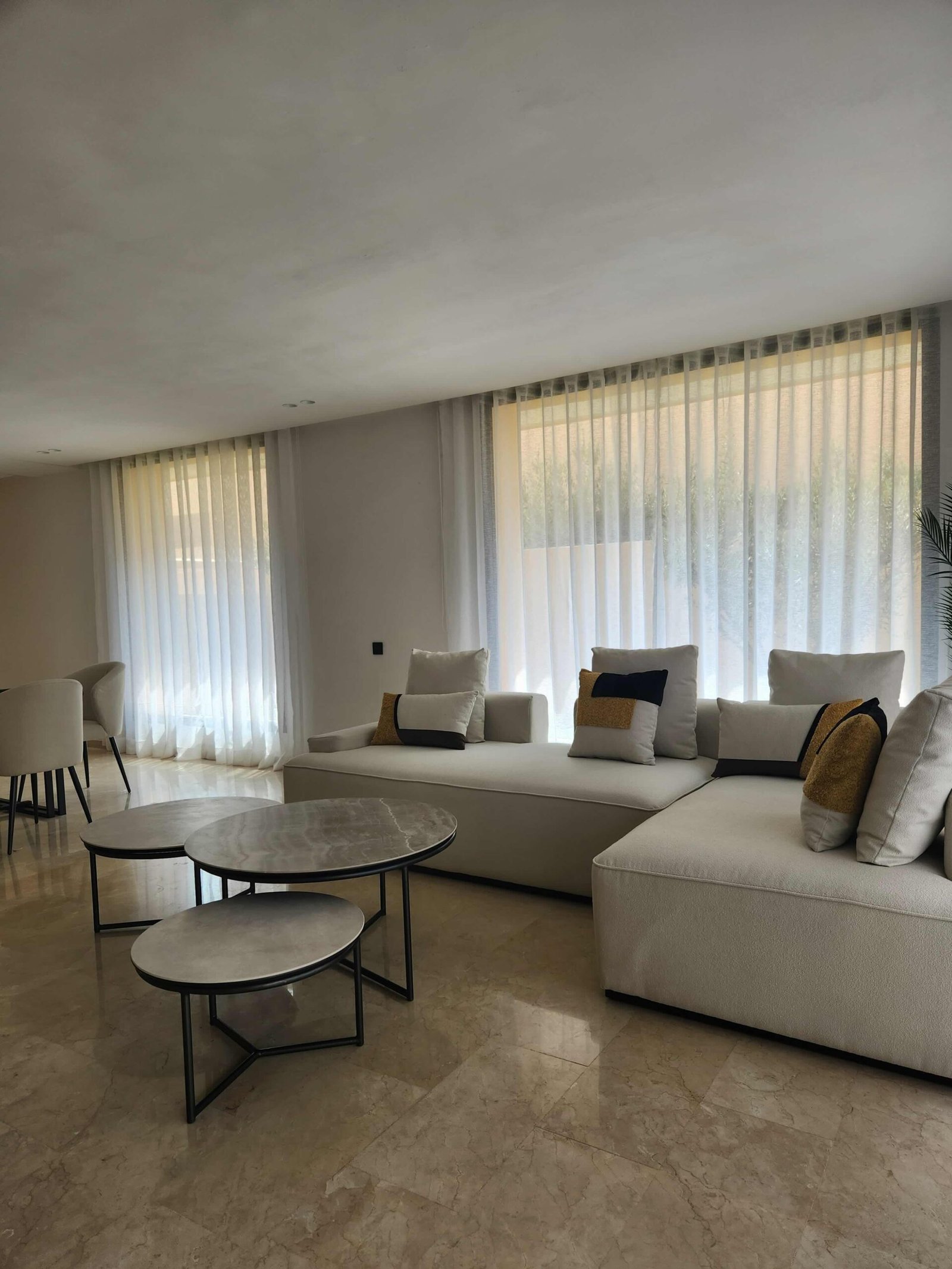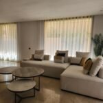 Un soin particulier a été porté aux espaces de vie : salon, salle à manger et cuisine s’enchaînent dans une fluidité maîtrisée. Les rideaux voilés jouent avec la lumière, créant des ambiances différentes selon l’heure du jour.